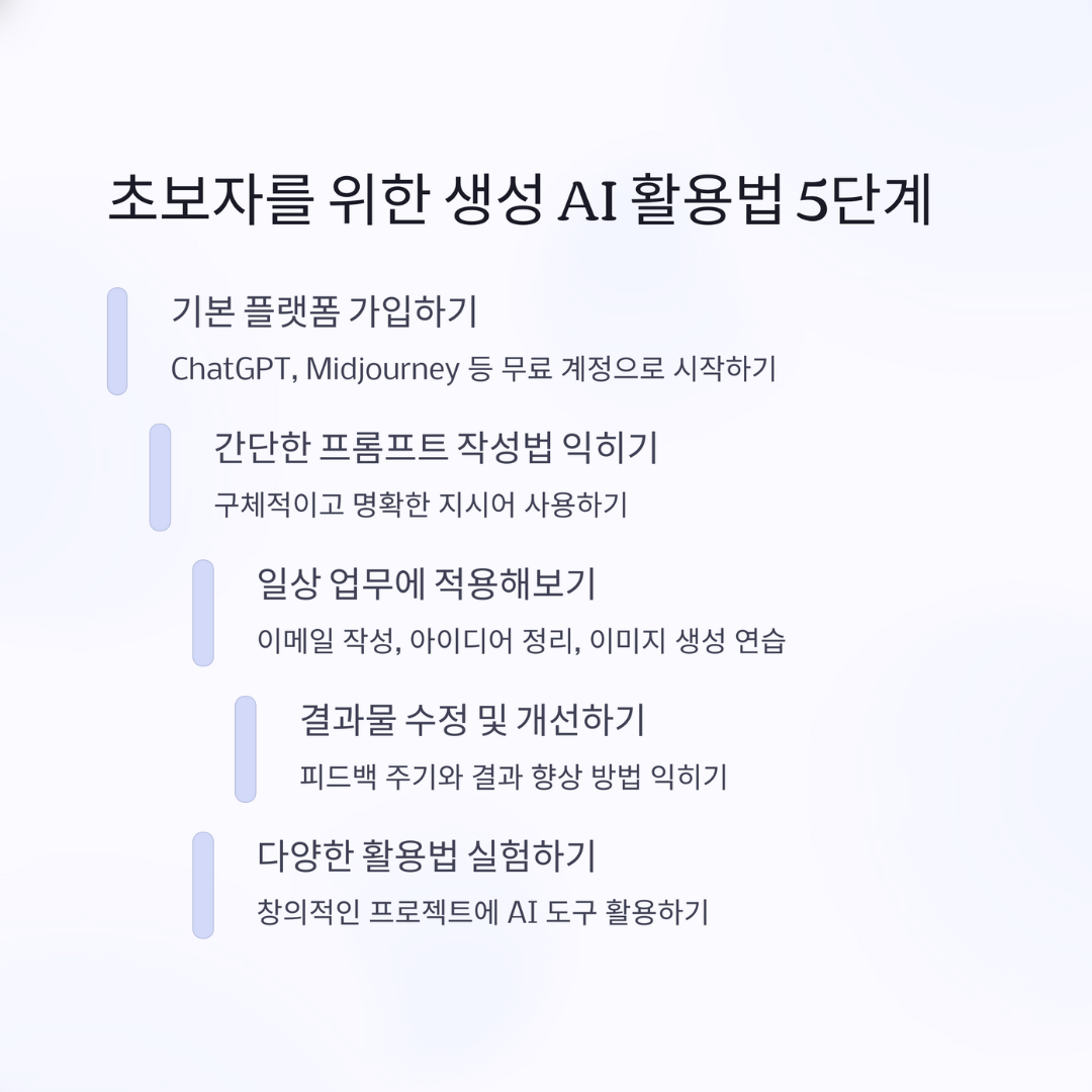 초보자가 생성 AI를 처음 접할 때 가장 효과적인 방법은 친숙한 플랫폼부터 시작하는 것입니다. ChatGPT로 간단한 질문을 하거나, DALL-E를 이용해 이미지를 만들어 보는 것만으로도 충분합니다. 또한, 다양한 프롬프트를 시도하면서 결과물을 비교하고 수정하는 과정을 통해 AI와의 상호작용 능력을 키울 수 있습니다. 꾸준히 사용하면서 감을 익히는 것이 무엇보다 중요합니다.