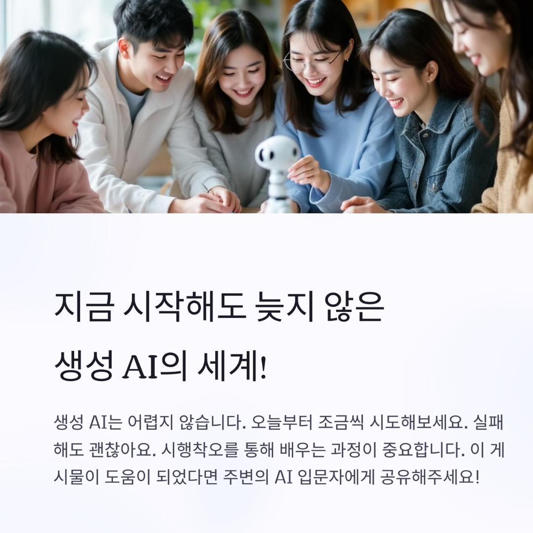 생성 AI는 미래를 준비하는 가장 강력한 무기가 될 것입니다. 초보자라 해도 두려워할 필요 없이, 간단한 활용부터 차근차근 시작해 보세요. 이해와 실습을 반복하면 어느 순간, 생성 AI가 일상 속 다양한 작업을 도와주는 든든한 파트너가 되어 있을 것입니다. 지금 시작해도 늦지 않았습니다. AI 시대에 맞춰 한 걸음 더 성장하는 여러분을 응원합니다.