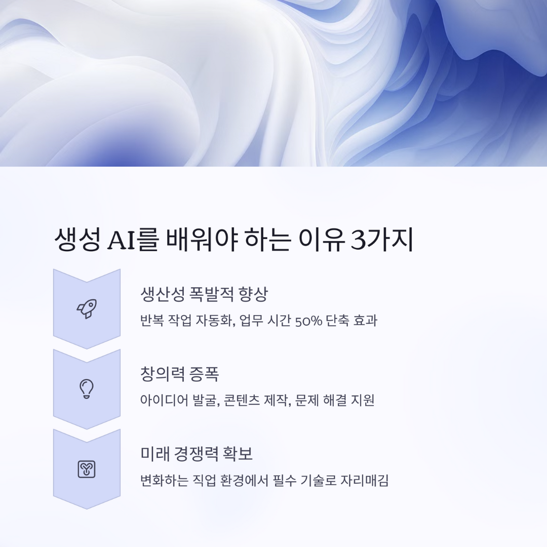 생성 AI를 배우는 가장 큰 이유 중 하나는 바로 업무 생산성과 창의력을 동시에 극대화할 수 있다는 점입니다. 문서 작성, 이미지 편집, SNS 콘텐츠 제작까지, 생성 AI를 활용하면 짧은 시간 안에 높은 품질의 결과물을 만들어낼 수 있습니다. 특히 반복적인 작업이 많은 직군이라면 생성 AI를 활용해 시간을 절약하고, 더 창의적인 일에 집중할 수 있습니다. 초보자라도 기본적인 활용법만 익히면 당장 실무에 적용할 수 있을 만큼 접근성이 높습니다.